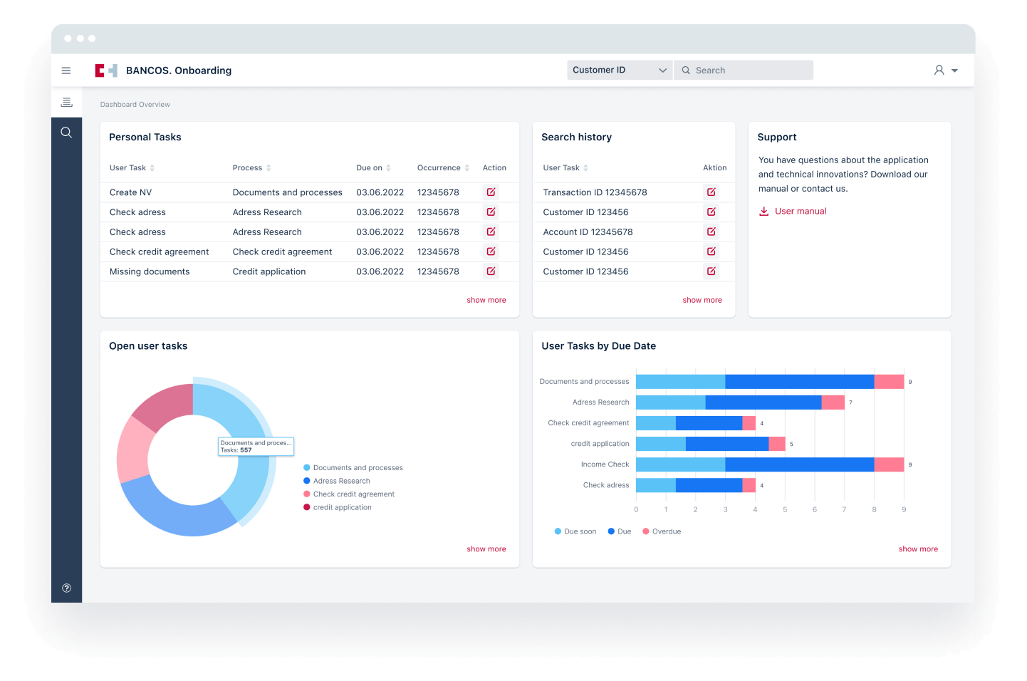 Leverage process automations’s full potential for application journeys of loans, deposits, accounts and cards with BANCOS Onboarding. This enables you to increase the efficiency of internal operational processes, unburden your employees from manual activities, and at the same time establish the foundations for a better customer experience that excels in speed and convenience. BANCOS Onboarding deploys Camunda for process orchestration, can be easily integrated into your existing IT infrastructure and optimized to fit your specific requirements.