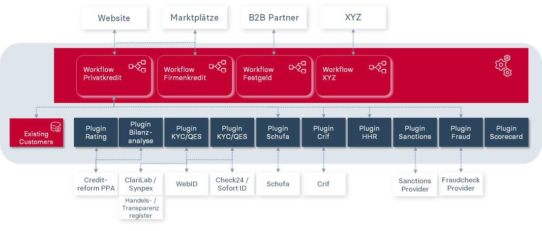 Unser Plugin-Repository enthält u.a. einsatzbereite Module für digitale Kontoprüfungen (DAC), die Überprüfung von Kundenidentitäten (KYC), qualifizierte elektronische Signaturen (QES) und die Integration von Auskunfteien. Jedes Plugin ist für eine nahtlose Integration in Ihre bestehenden Systeme konzipiert, was die Entwicklungszeit erheblich verkürzt und gleichzeitig die vollständige Einhaltung regulatorischer Anforderungen gewährleistet.